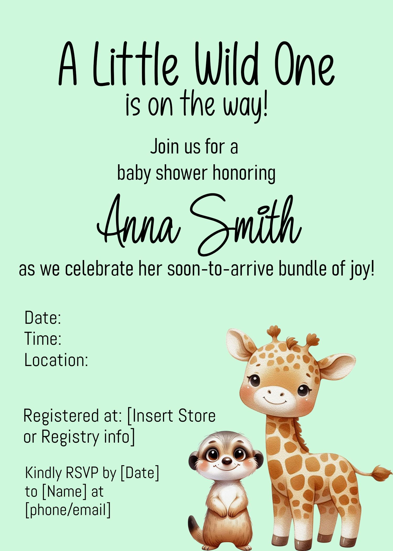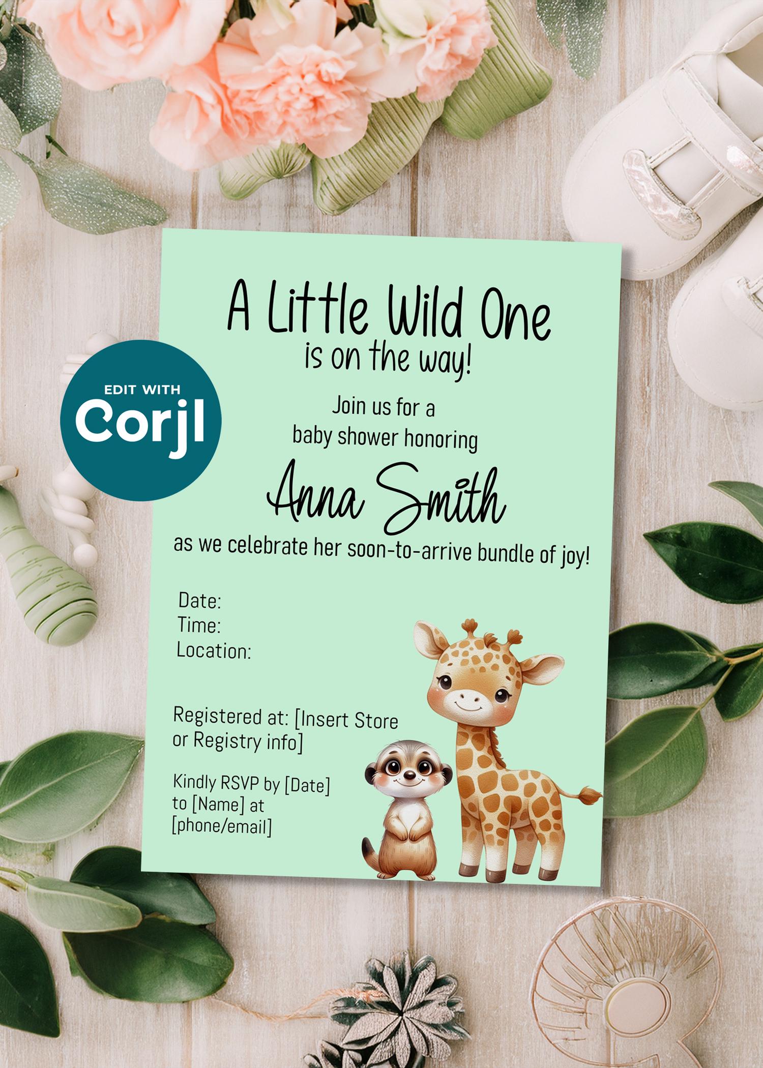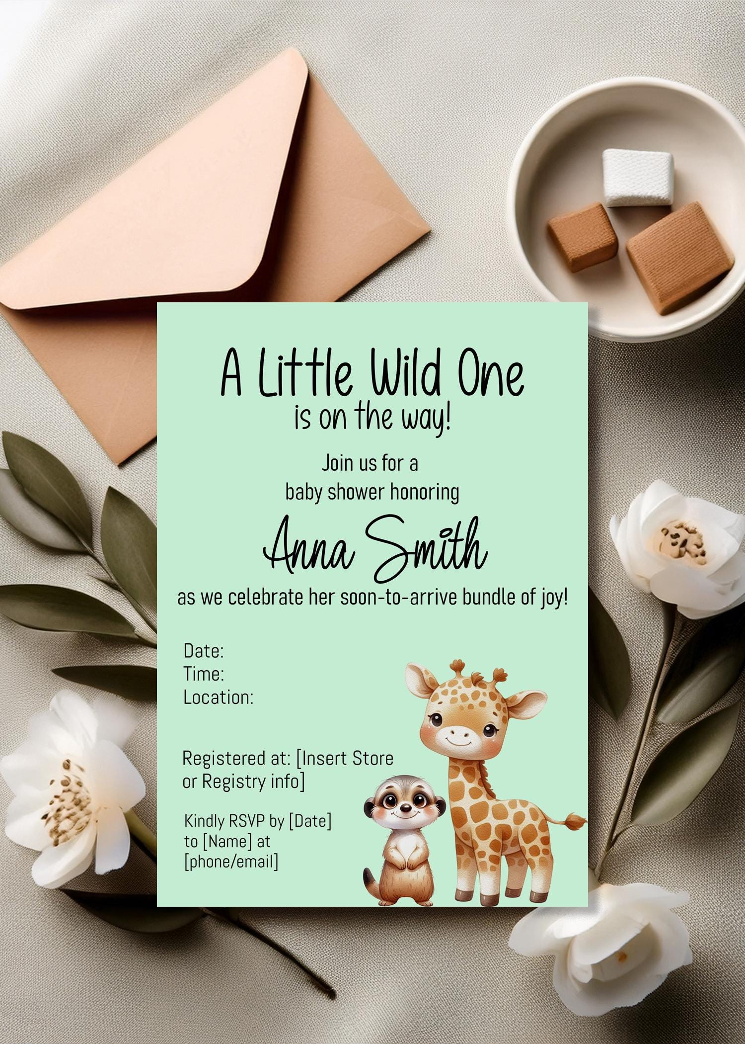 Celebrate your upcoming arrival with this adorable safari-themed baby shower invitation! Featuring a pastel green background and sweet jungle animals like a giraffe and meerkat, this editable digital template is perfect for a gender-neutral baby shower.