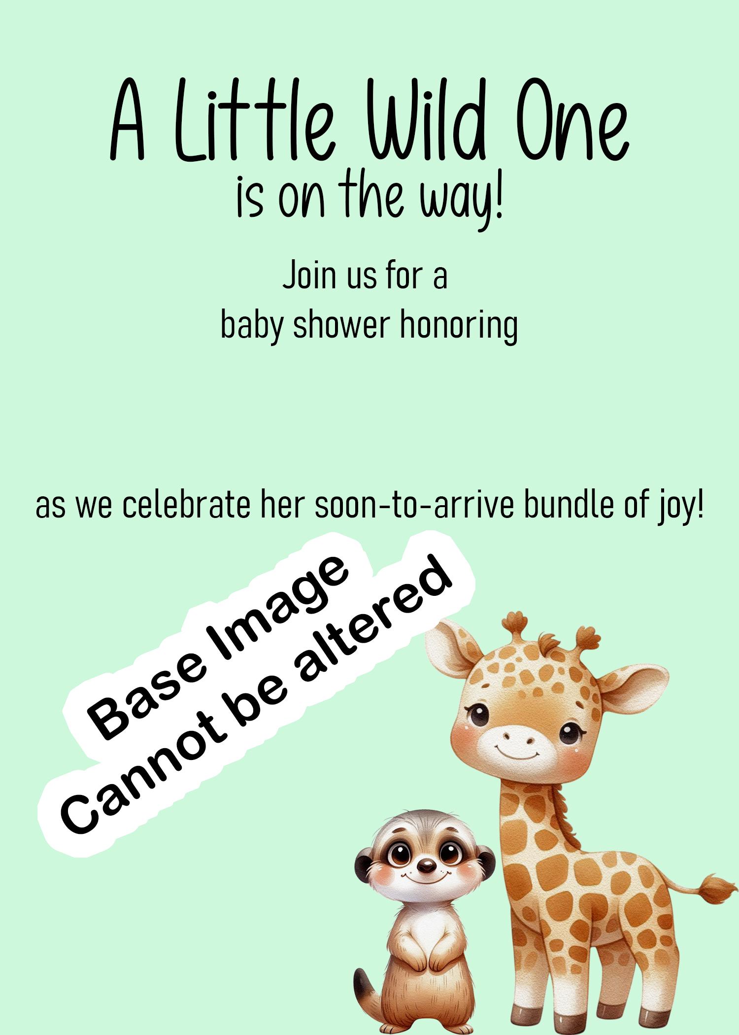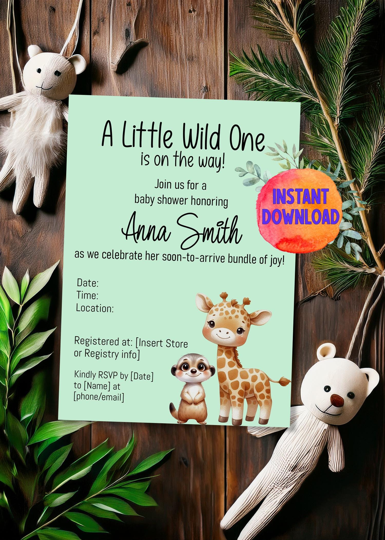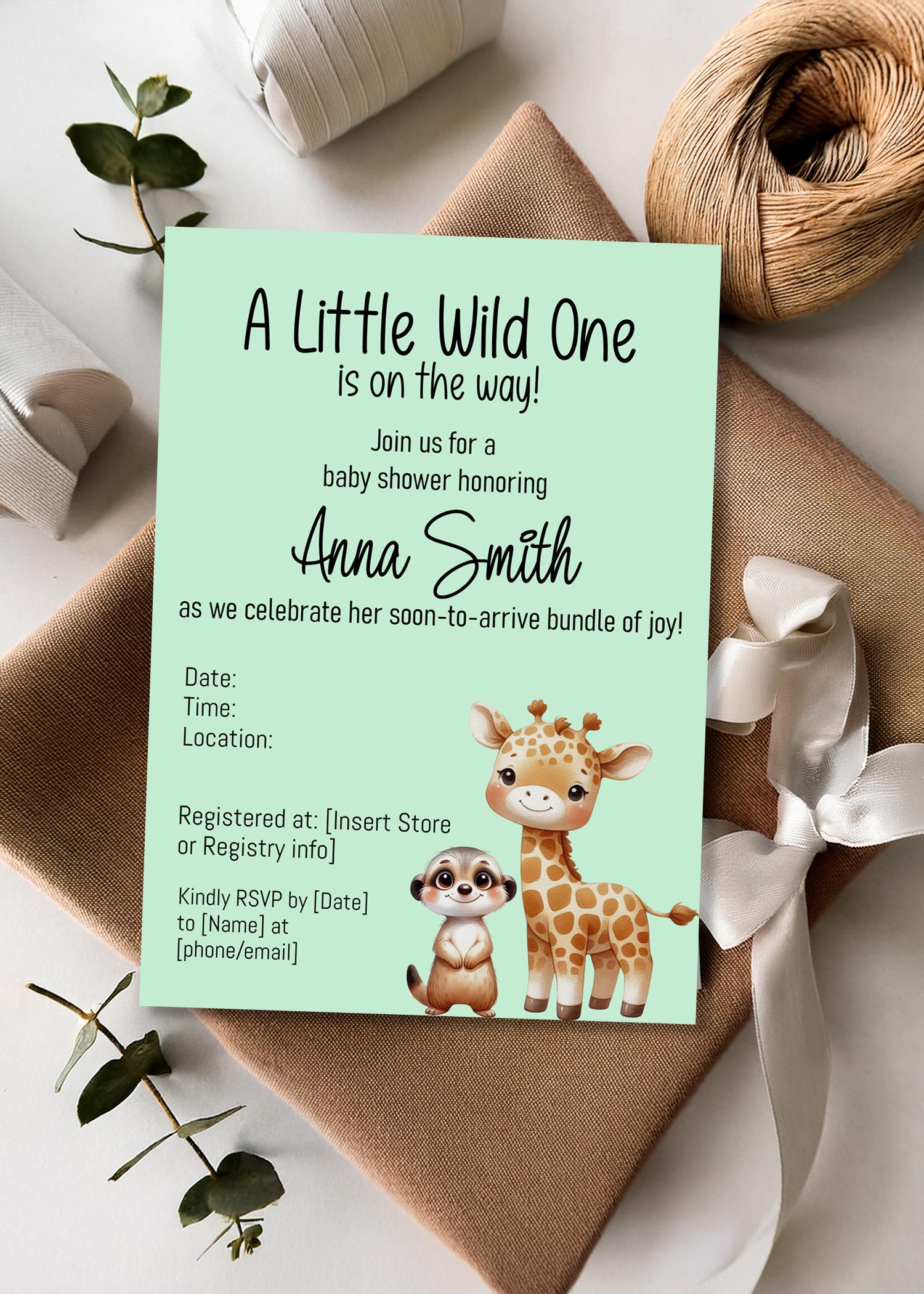 Celebrate your upcoming arrival with this adorable safari-themed baby shower invitation! Featuring a pastel green background and sweet jungle animals like a giraffe and meerkat, this editable digital template is perfect for a gender-neutral baby shower.