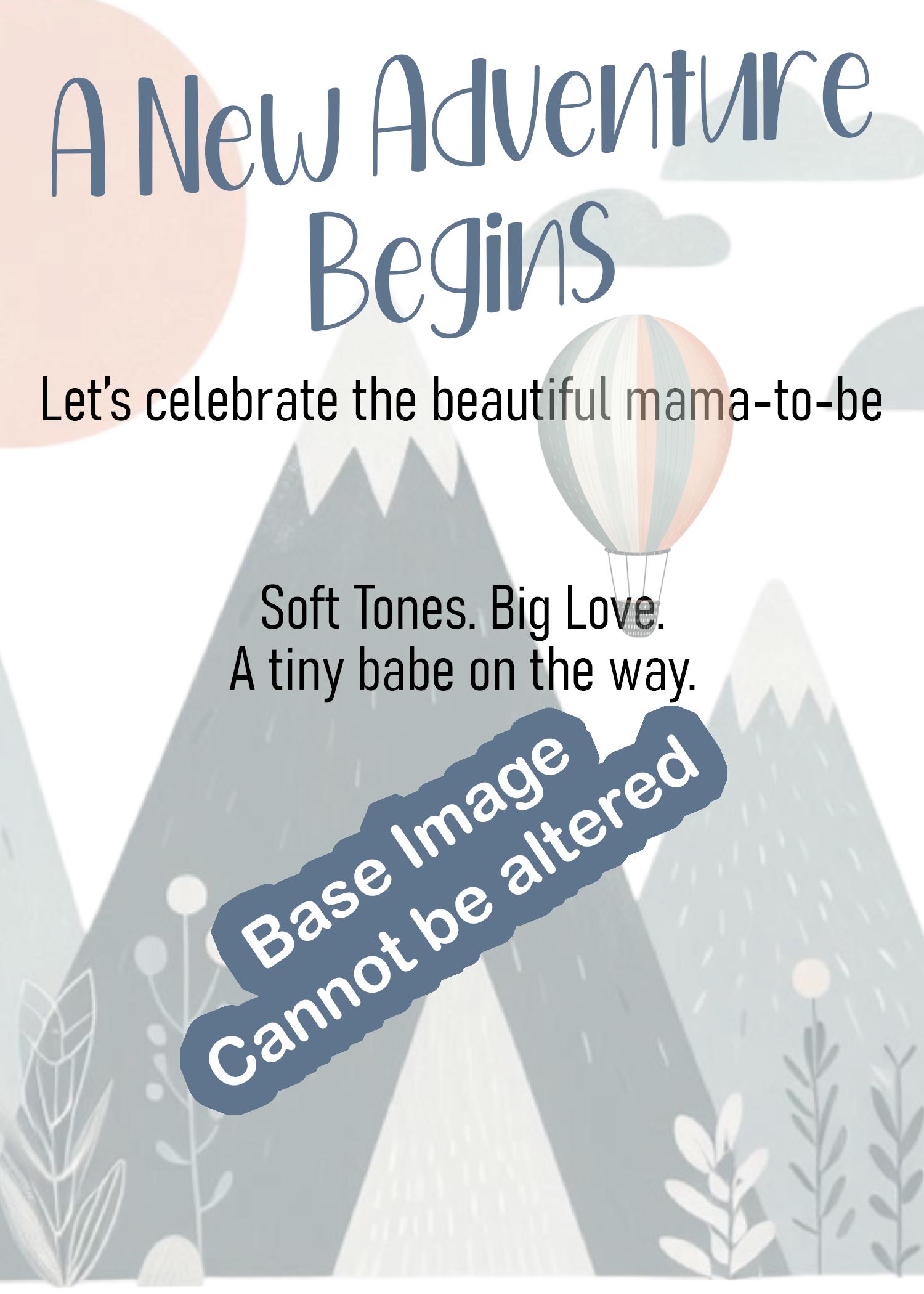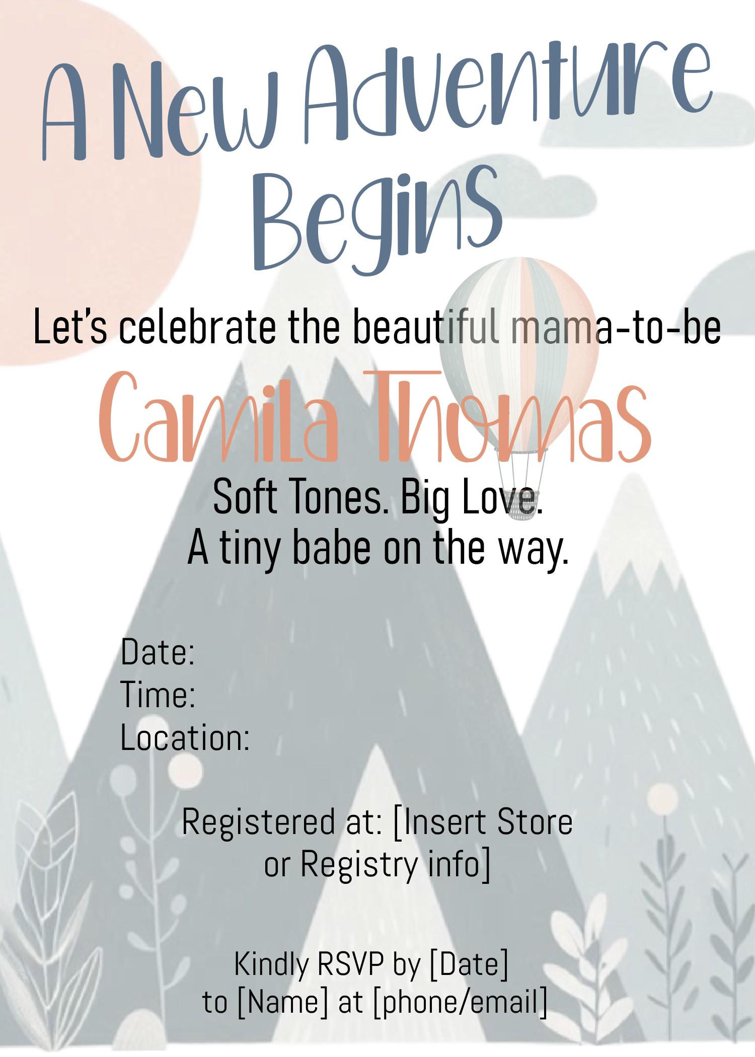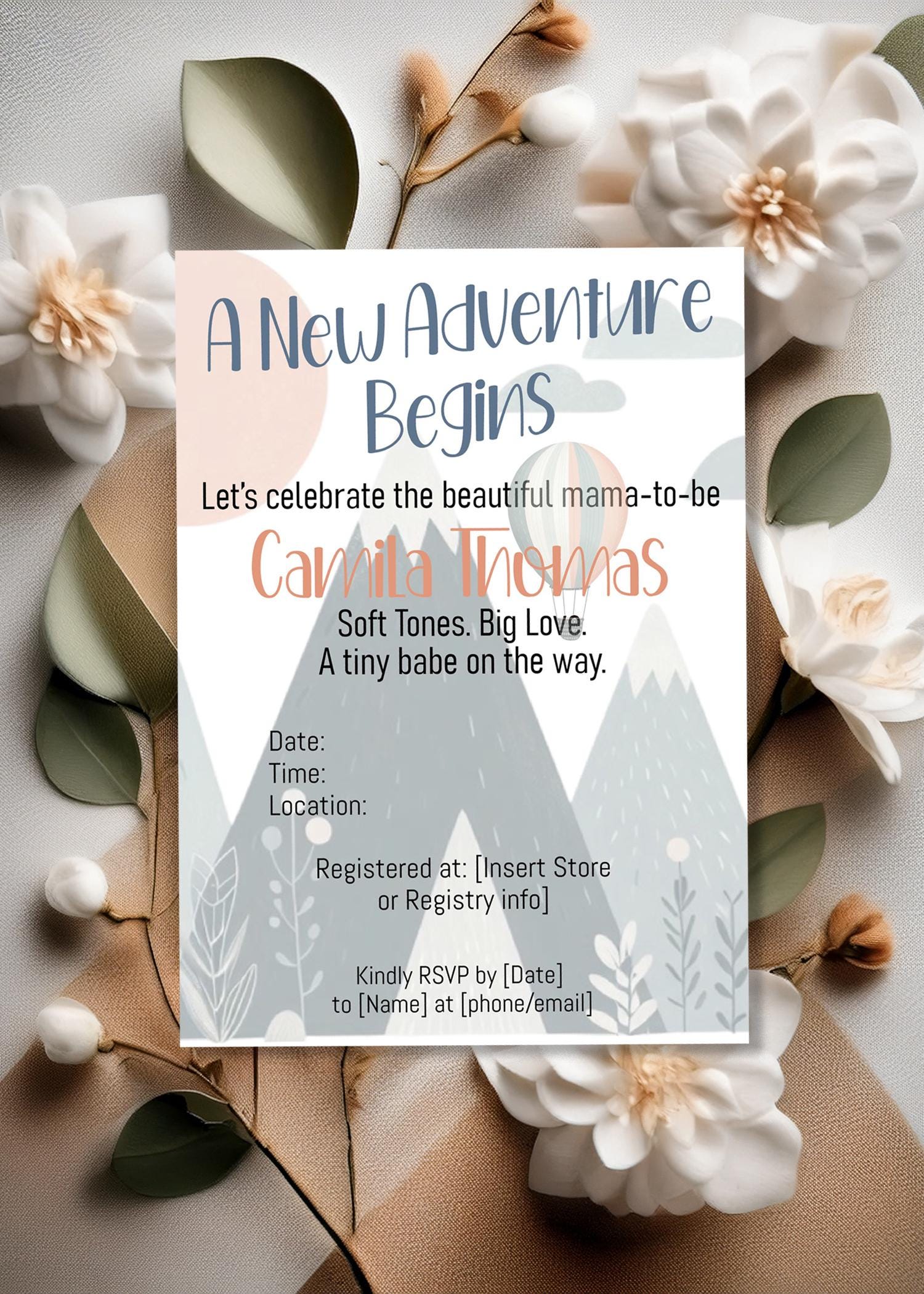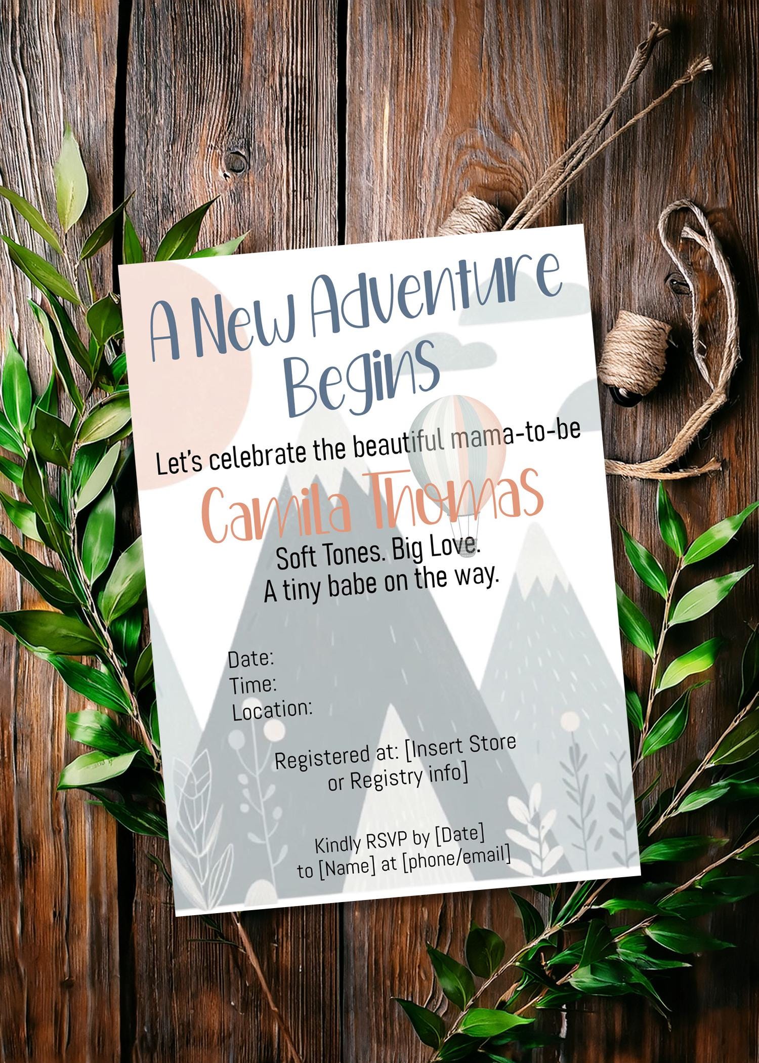 Celebrate the mama-to-be with this “A New Adventure Begins” Baby Shower Invitation. Featuring soft, neutral tones with mountain and hot air balloon illustrations, this invitation is perfect for gender neutral baby showers or adventure-themed celebrations.