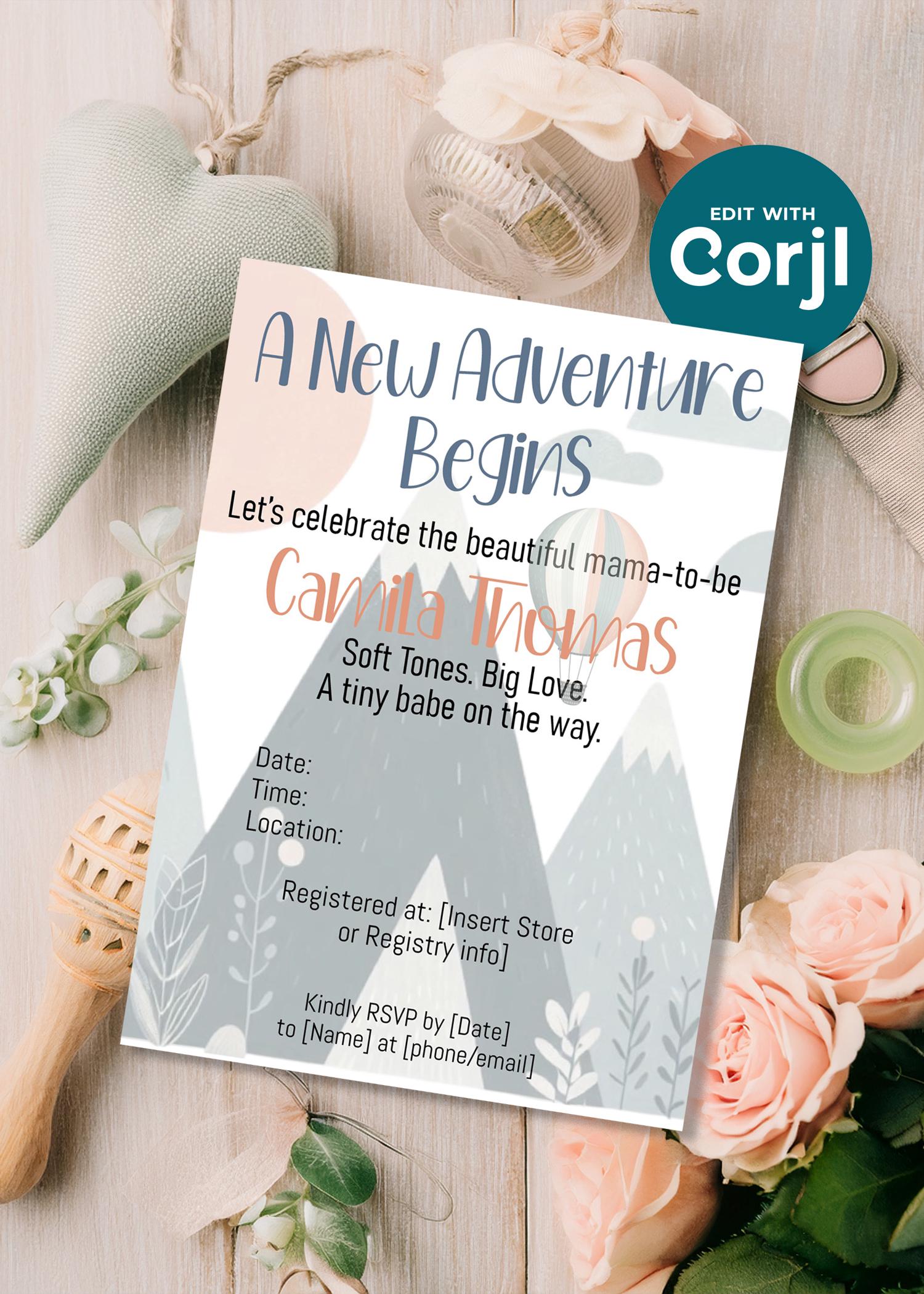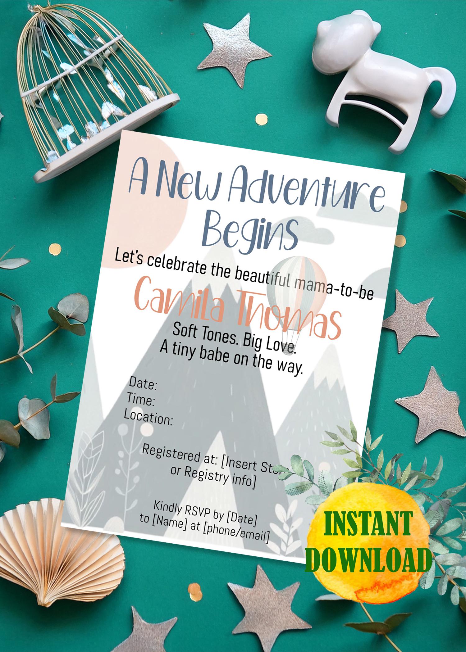 Adventure Baby Shower Invitation: Mountain & Hot Air Balloon Theme (Digital Download