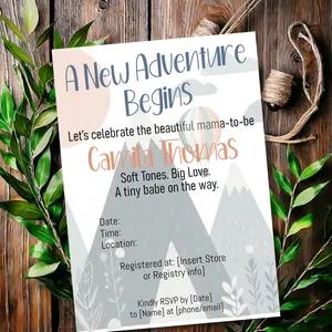 Celebrate the mama-to-be with this “A New Adventure Begins” Baby Shower Invitation. Featuring soft, neutral tones with mountain and hot air balloon illustrations, this invitation is perfect for gender neutral baby showers or adventure-themed celebrations.